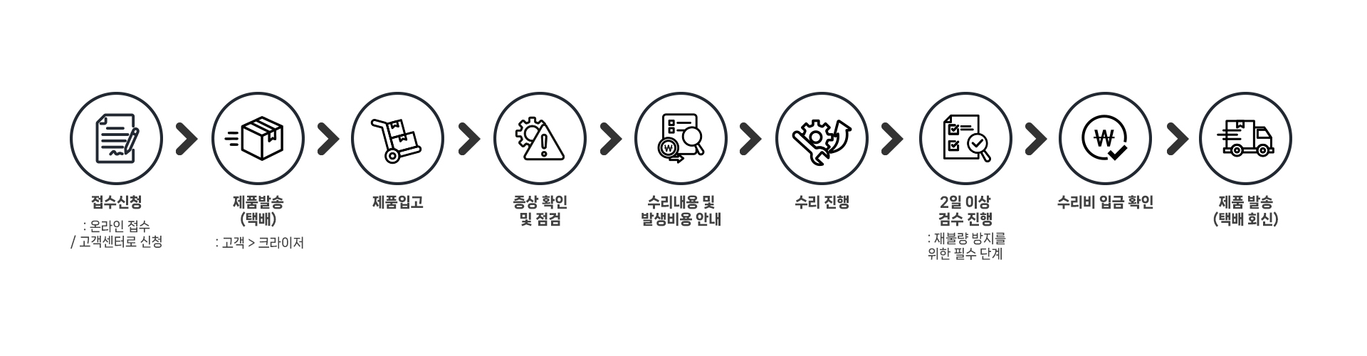 크라이저의 A/S는 아래 절차에 따라 신속하고 정확하게 진행됩니다.